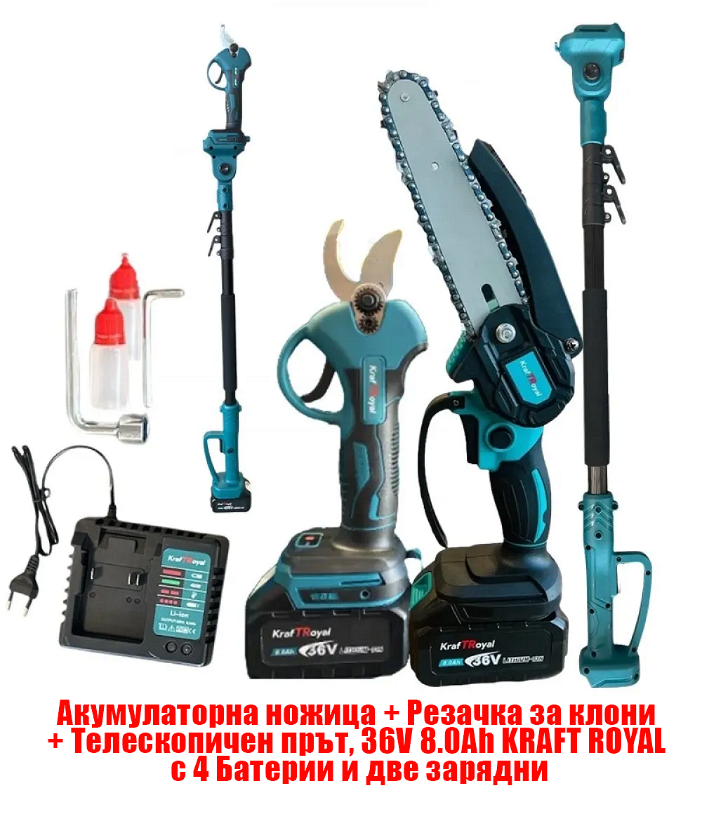 3 в 1 Градински комплект KRAFT ROYAL – акумулаторна ножица, резачка и телескопичен прът 36V 8.0Ah