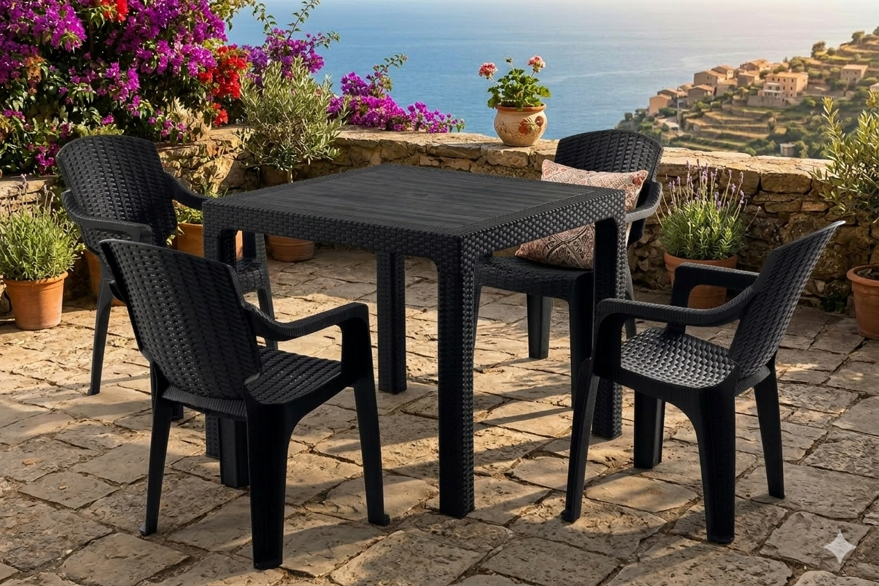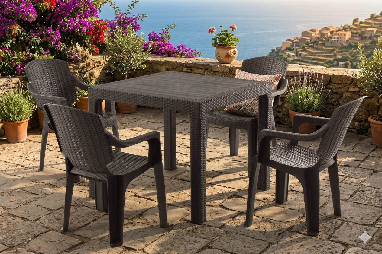 Създайте уютна и функционална зона за почивка с този модерен градински комплект, включващ маса и 4 удобни стола с подлакътници. Подходящ както за дома, така и за търговски обекти, този комплект комбинира издръжливост, лекота и елегантен дизайн.