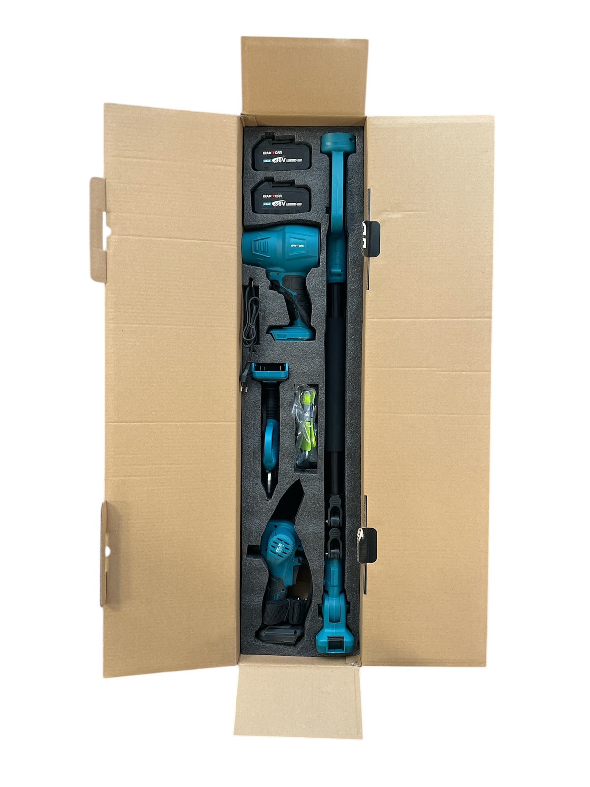 Доверете се на практичния акумулаторен комплект 4 в 1, създаден да улесни всяка дейност в градината. Съчетавайки електрическа лозарска ножица, мини верижен трион с 15 см шина и маслен филтър, телескопичен удължител до 2 м и мощен турбо въздушен пистолет (духалка), този комплект предлага пълно решение за подрязване, почистване и поддръжка на растения и дървета.