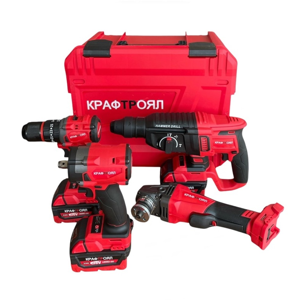 Този професионален комплект 4 в 1 включва перфоратор, ъглошлайф 125 мм, гайковерт и винтоверт, захранвани от 36V / 8Ah Li-Ion батерии (3 броя). Благодарение на новата технология KraftRoyal Red MX Fuel 2025, всяка машина предлага повече сила, по-дълга работа и по-малко загряване.