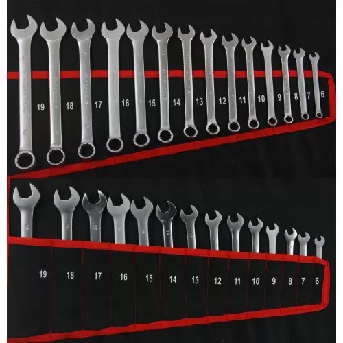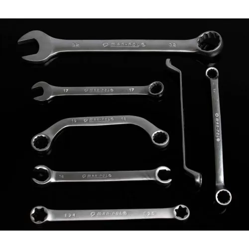Комбинирани гаечни ключове: 6, 7, 8, 9, 10, 11, 12, 13, 14, 15, 16, 17, 18, 19, 20, 21, 22, 23, 24, 26, 27, 28, 30, 32 Гаечни ключове TORX 6×8, 10×12, 14×18, 20×24 Гаечни ключове с огънати халки 6×7, 8×9, 10×11, 12×13, 14×15,x16x17, 18×19, 20×22