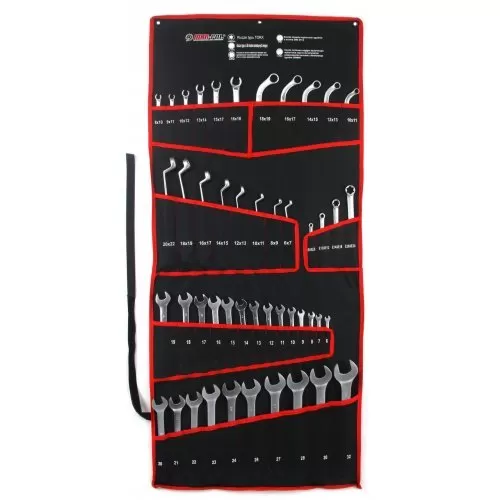 Комплект от 47 ключа е опакован в удобен навиващ се калъф, благодарение на който заема малко място (калъф с велкро закопчаване).