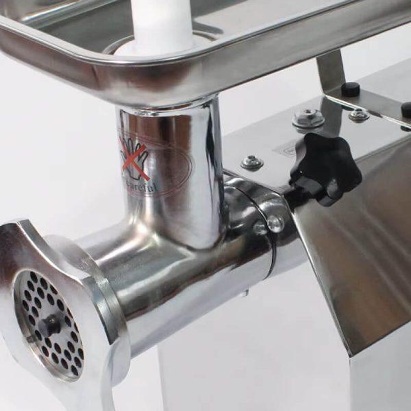Корпусът е изработен от неръждаема стомана (алпака), която не ръждясва, издържа на ежедневно почистване и гарантира дълъг живот на машината. Високата мощност от 900W и стабилният мотор осигуряват плавна и непрекъсната работа, позволявайки смилане до 150 кг месо на час.