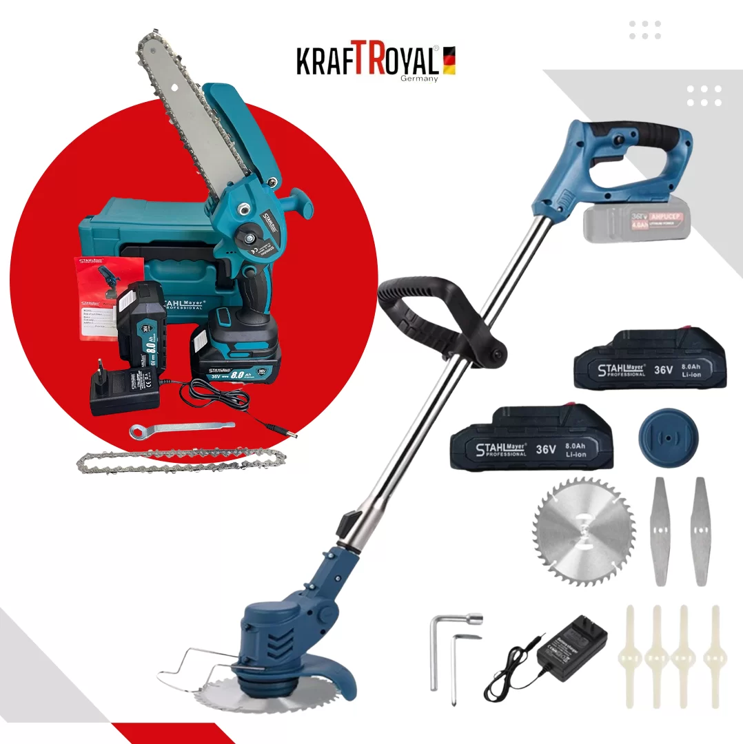 Открий пълното решение за поддръжка на двора с акумулаторния градински комплект KRAFTROYAL 36V 8.0Ah, който включва тример за трева с телескопична дръжка и резачка за клони с 15 см шина и 2 вериги. Перфектният избор за всеки, който търси надеждност, мобилност и висока производителност при работа на открито.